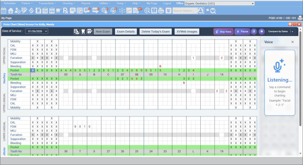 Perio measurements are captured using a consistent voice-driven structure that behaves the same across providers and locations.