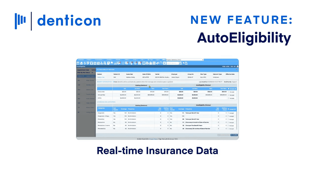 AutoEligibility eliminates portal logins and payer calls by surfacing standardized eligibility and coverage details. This includes deductibles, frequency limits, and Medicaid directly inside Denticon.